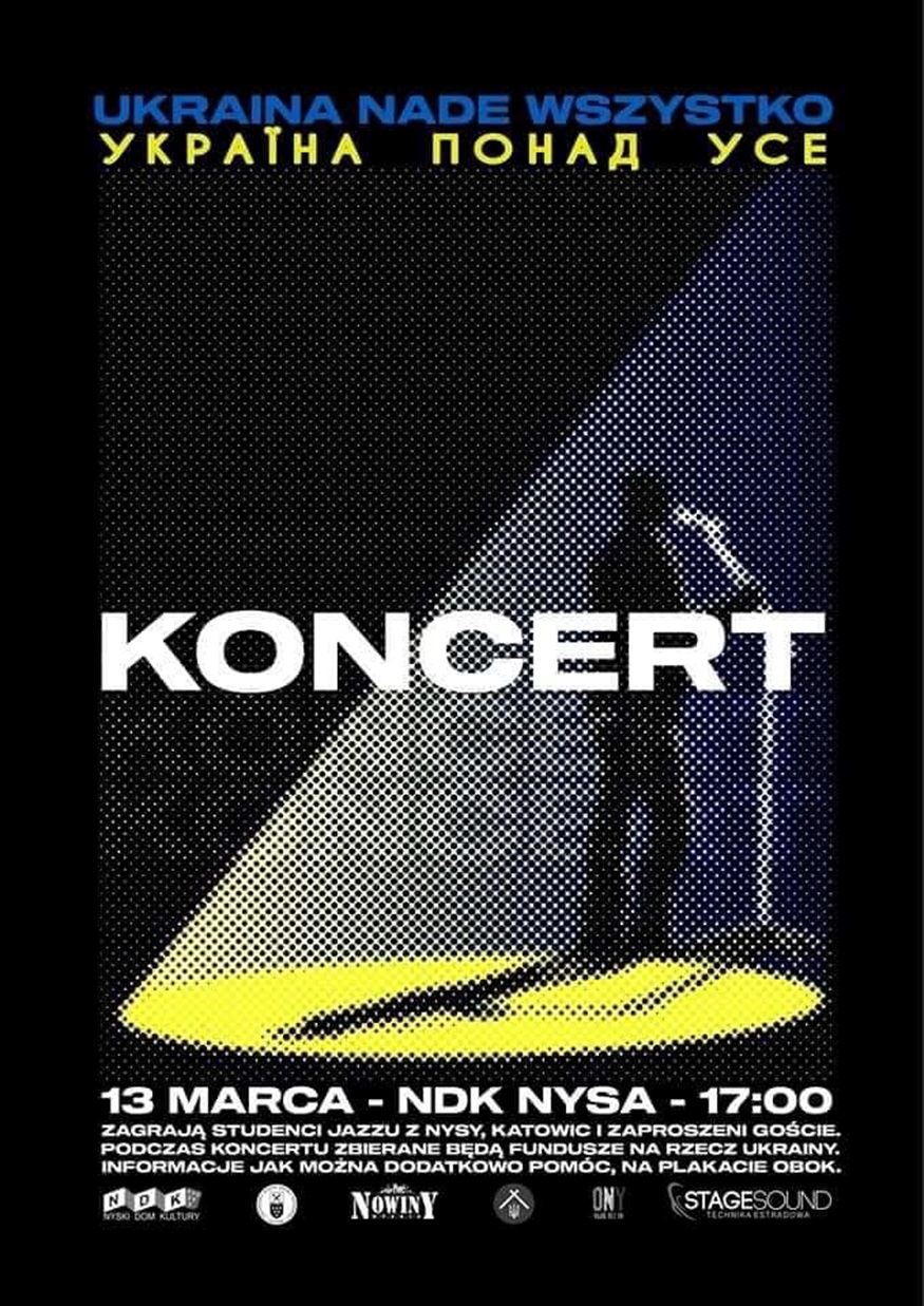Studenci i przyjaciele Wydziału Jazzu PWSZ w Nysie, zapraszają na koncert charytatywny "Ukraina nade wszystko". Podczas koncertu, usłyszeć będzie można utwory w języku polskim, angielskim i ukraińskim, wszystkie w klimacie jazzu.