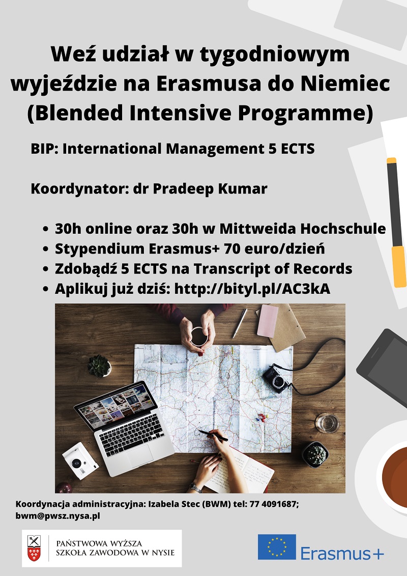 Po raz pierwszy PWSZ w Nysie będzie współorganizatorem Blended Intensive Programme  (BIP) w ramach Programu Erasmus Plus. Koordynatorem Projektu jest Fachhochschule Mittweida (Niemcy), a partnerem University of the Basque Country (Hiszpania).