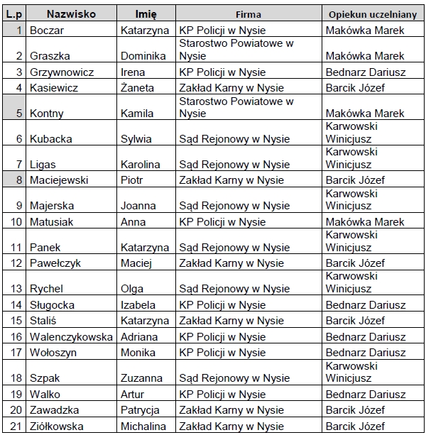 W ramach przeprowadzonego pierwszego naboru studentów do udziału w Programie praktyk zawodowych w Państwowych Wyższych Szkołach Zawodowych”, realizowanym w ramach PO WER - Oś III Szkolnictwo Wyższe dla gospodarki i rozwoju, komisja konkursowa zakwalifikowała następujących studentów z III roku Instytutu Bezpieczeństwa do udziału w projekcie.