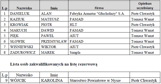 W ramach przeprowadzonego pierwszego naboru studentów do udziału w Programie praktyk zawodowych w Państwowych Wyższych Szkołach Zawodowych”, realizowanym w ramach PO WER - Oś III Szkolnictwo Wyższe dla gospodarki i rozwoju, komisja konkursowa zakwalifikowała następujących studentów z III roku Kierunku Zarządzanie i Inżynieria Produkcjido udziału w projekcie.