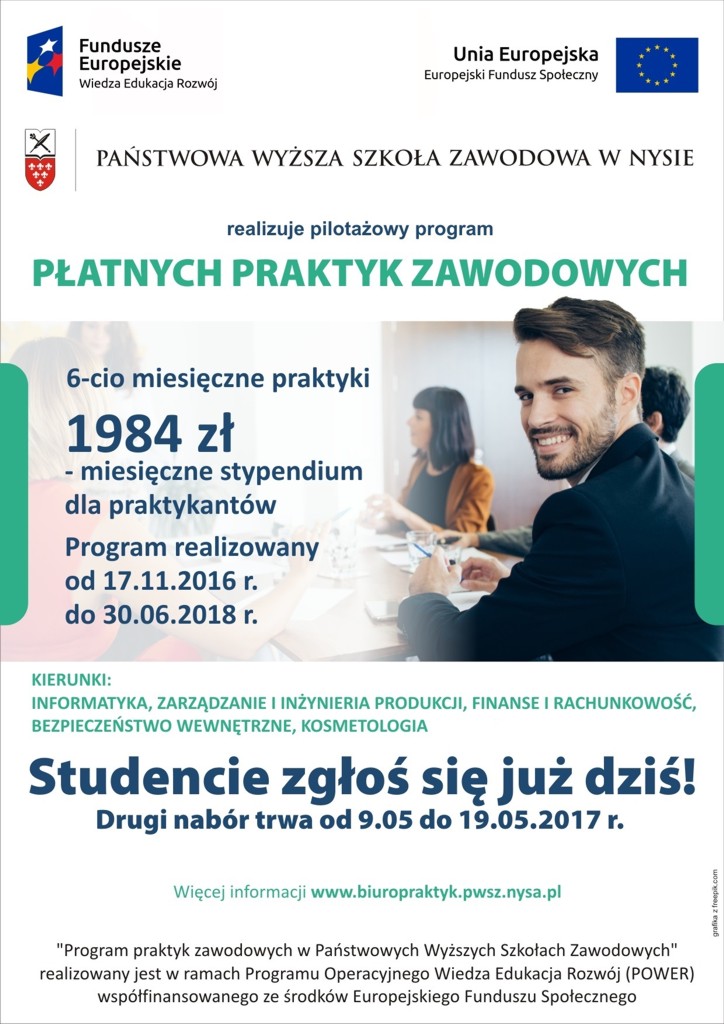 Uruchomiony został drugi nabór studentów Państwowej Wyższej Szkoły Zawodowej w Nysie do udziału w pilotażowym programie, 6-cio miesięcznych płatnych praktyk zawodowych, skierowanym do studentów 5-ciu kierunków. Nabór potrwa do 19.05.2017 r.