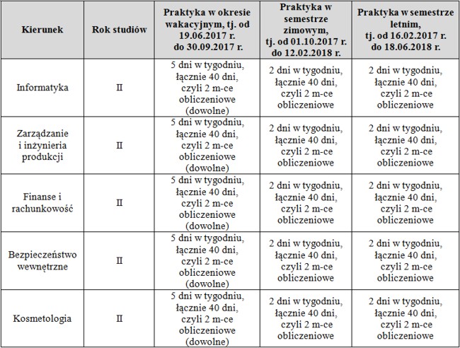 Na wszystkich kierunkach studiów, w ramach których zakładana jest realizacja praktyki w tygodniu, podczas semestru, zajęcia zostaną ułożone w taki sposób, aby studenci posiadali wymaganą liczbę dni wolnych w tygodniu do uczestniczenia w praktykach.