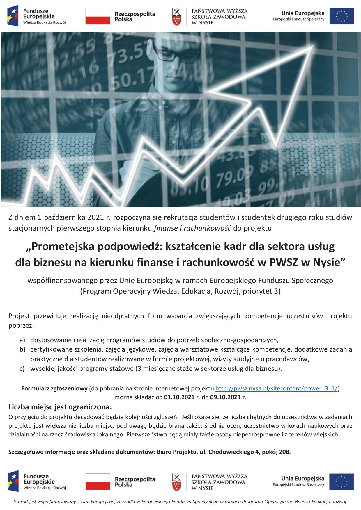 Od czerwca do września 2021 studenci studiów stacjonarnych kierunku finanse i rachunkowość w ramach projektu POWER 3.1 pt. "Prometejska podpowiedź: kształcenie kadr dla sektora usług dla biznesu na kierunku finanse i rachunkowość w PWSZ w Nysie" zrealizowali 3-trzymiesięczne płatne staże w sektorze usług dla biznesu.