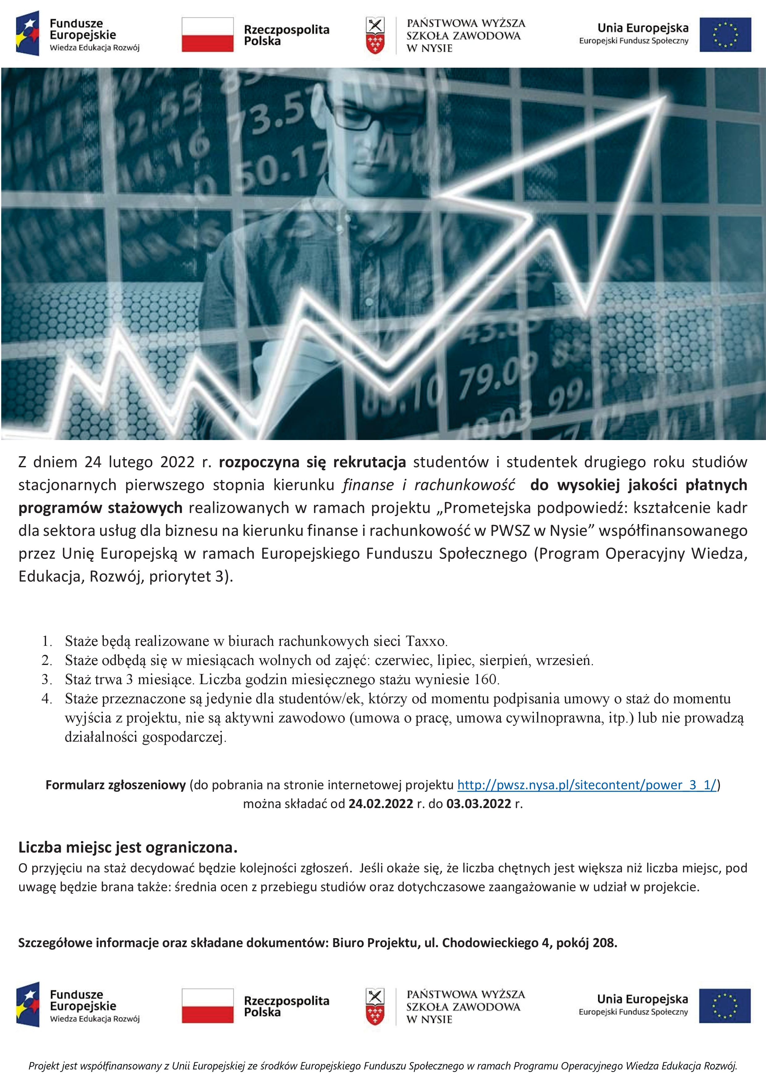Od czerwca do września 2022 studenci studiów stacjonarnych kierunku finanse i rachunkowość w ramach projektu POWER 3.1 pt. "Prometejska podpowiedź: kształcenie kadr dla sektora usług dla biznesu na kierunku finanse i rachunkowość w PWSZ w Nysie" zrealizowali 3-trzymiesięczne płatne staże w sektorze usług dla biznesu.