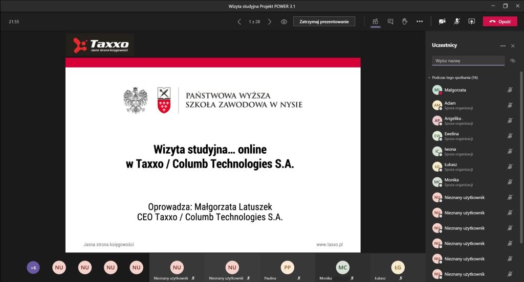 W dniu 21 stycznia 2022 studenci drugiego i trzeciego roku kierunku finansów i rachunkowość wzięli udział w wizycie studyjnej on-line w Taxxo / Columb Technologies S.A. ul. Łubinowa 1 f/7, 52-210 Wrocław. Wizytę prowadziła Pani Małgorzata Latuszek, Prezes Zarządu.